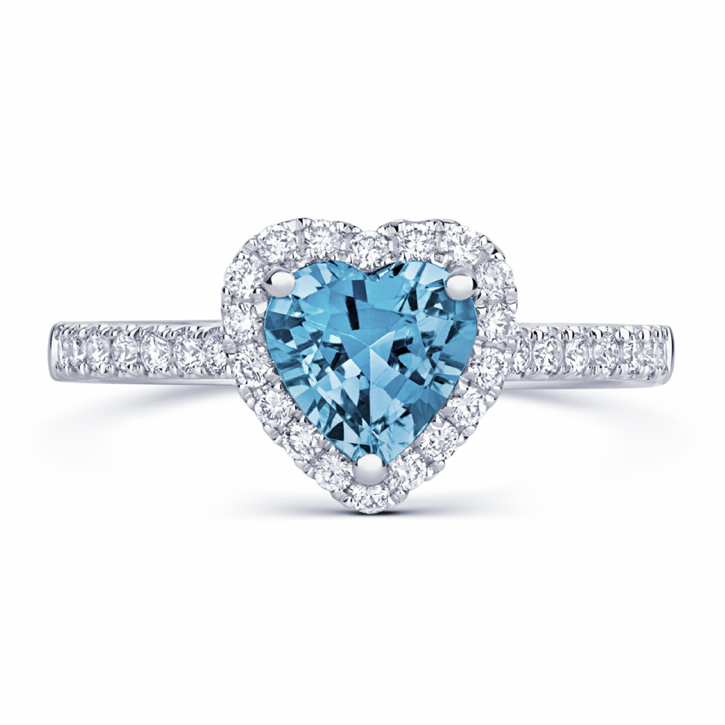 This gorgeous ring features a bright heart shaped Santa Maria aquamarine surrounded by a halo of round brilliant cut diamonds. Expertly set with fine platinum claws, this stylish ring sits beautifully on the finger and is enhanced with polished platinum shoulders set with round brilliant cut diamonds to complement the halo. This feature helps to lead the eye to the beautiful aquamarine set to the centre.