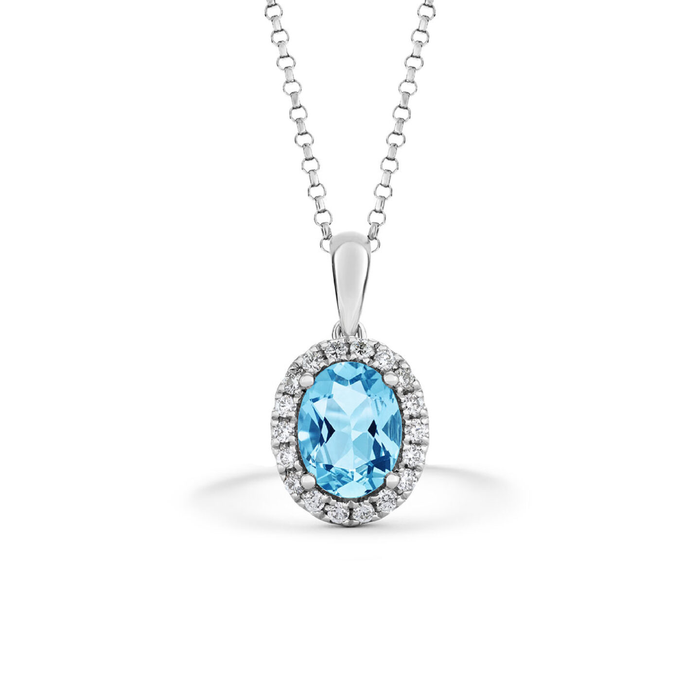 This classic oval shaped pendant features a single faceted oval Santa Maria aquamarine surrounded by a halo of round brilliant cut diamonds. Expertly claw set in 18ct white gold, securing these precious gemstones, this elegant pendant is completed with an 18ct white gold trace chain.