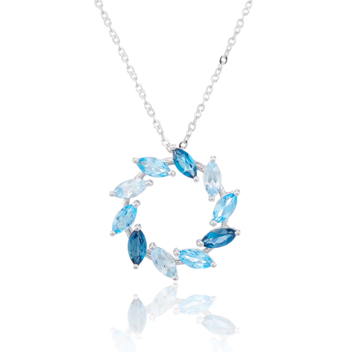 This beautiful pendant features ten faceted marquise cut blue topaz gemstones, each claw set in white gold and arranged in a circle. The gemstones vary in shades, from pale to dark blue. This pretty pendant is completed with a polished 9ct white gold trace chain that has the benefit of being adjustable between 16″ and 18″ offering versatility for the wearer.