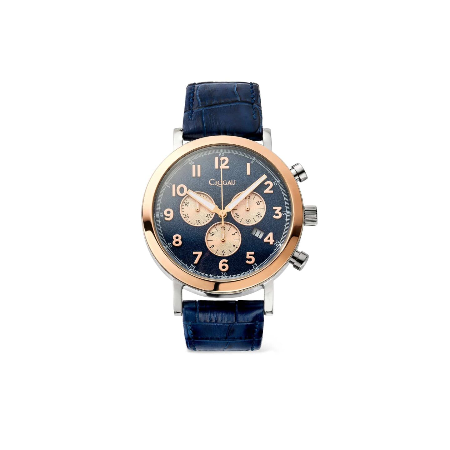 This Clogau Gwynant watch is a stylish fusion of classic chronograph styling and cutting-edge technology. The polished stainless steel case is ion plated with rose gold, and features a textured navy blue dial and contrasting silver-tone hands and numerals. The timepiece is held securely on a matching grained navy blue leather strap. A Swiss-made quartz movement provides incredible accuracy when every second counts.