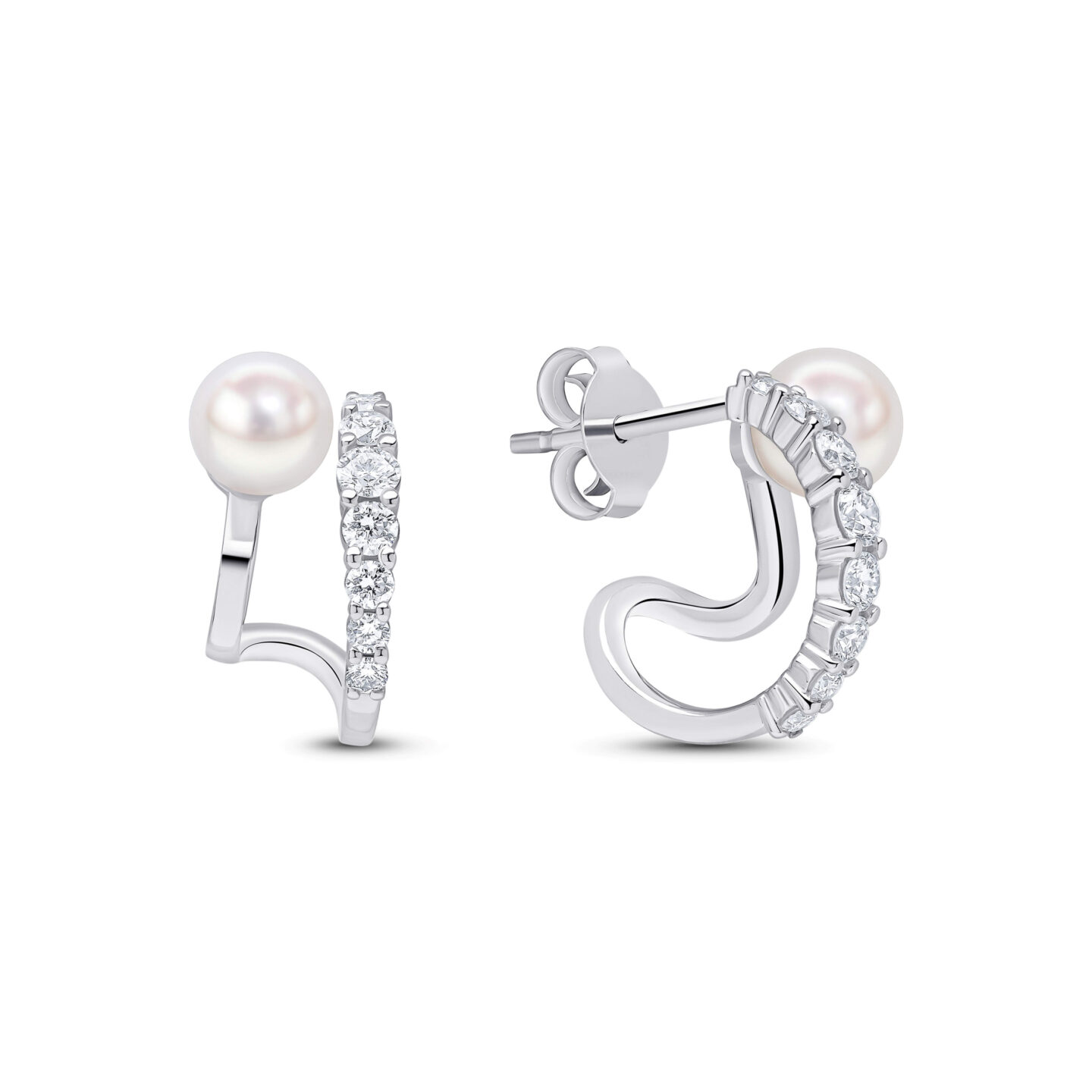 These stylish earrings feature a curved row of round brilliant cut diamonds that hug the ear lobe and a single cultured pearl sits alongside. Crafted from 18ct white gold, these versatile earrings are suited to both day and evening wear, completed with 18ct white gold post and scroll fittings for a comfortable fit.