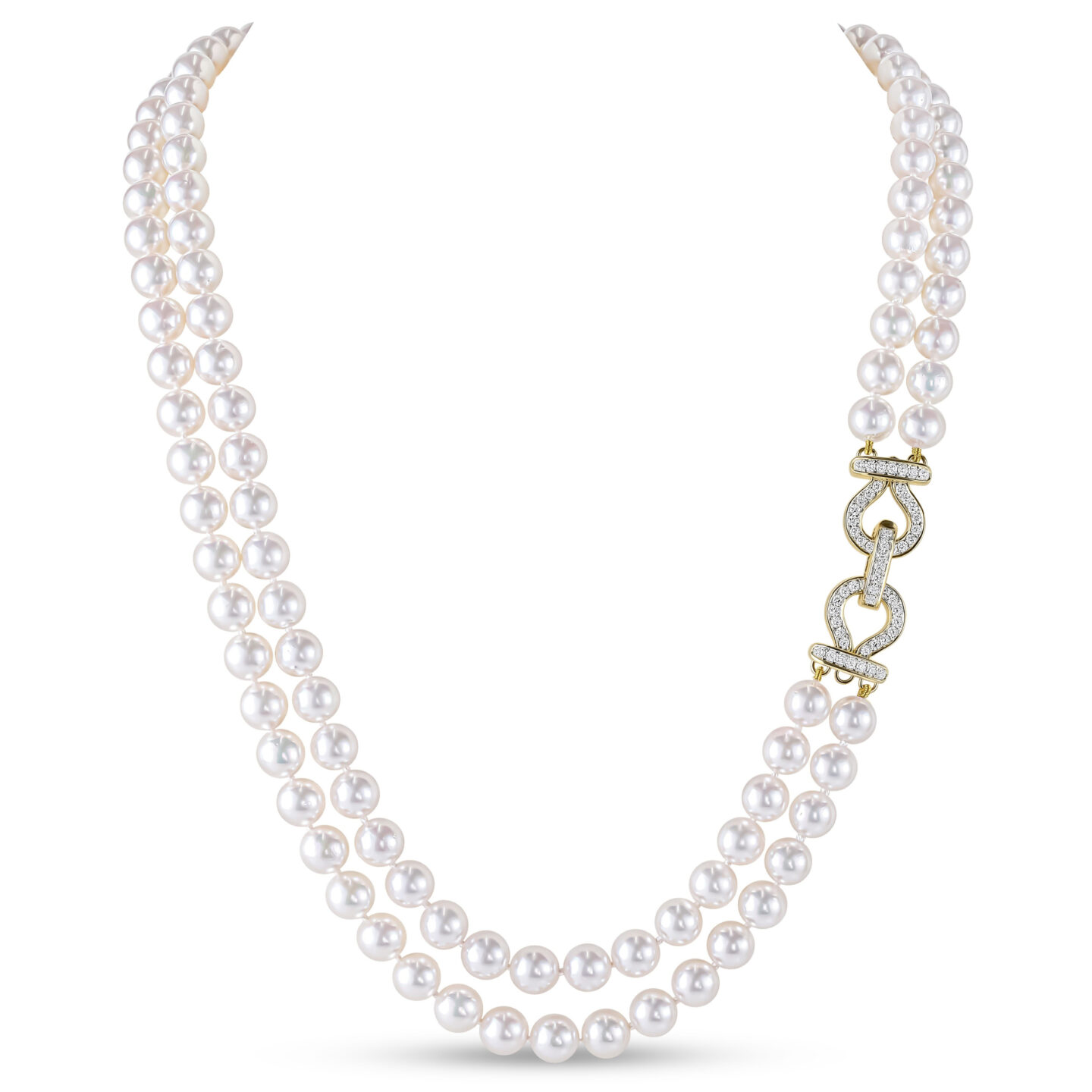 This stunning necklace features two rows of cultured pearls, each measuring 6.5-7mm in diameter and secured with a dazzling diamond set 18ct yellow gold loop-link feature clasp. A popular bridal, anniversary or birthday gift with matching necklace also available.