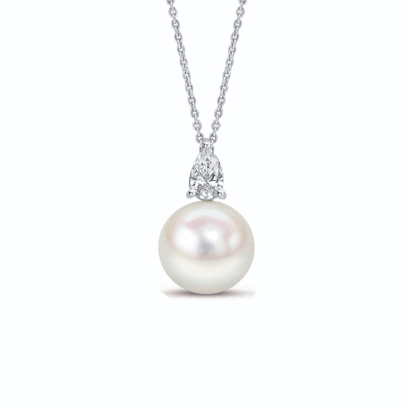 This beautiful pendant features a single pear cut diamond with a cultured pearl set below. Crafted from 18ct white gold, this elegant pendant is combined with an 18ct white gold trace chain which has the added benefit of being adjustable between 16″, 17″ and 18″ in length for added versatility for the wearer. This classic style is a popular bridal, anniversary or birthday gift with matching earrings also available.