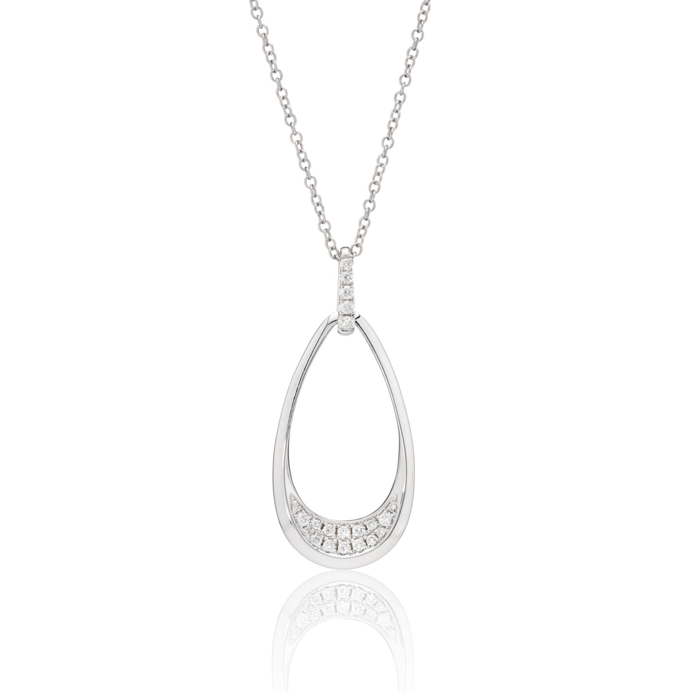 Featuring round brilliant cut diamonds set to the inside of the base of this elegant open pear-shape, this pretty pendant has been crafted from 9ct white gold. Enhanced further with diamonds set to the bail and completed with a 9ct white gold trace chain that has the benefit of being adjustable for the wearer to enjoy at either 16″, 17″ or 18″ long.