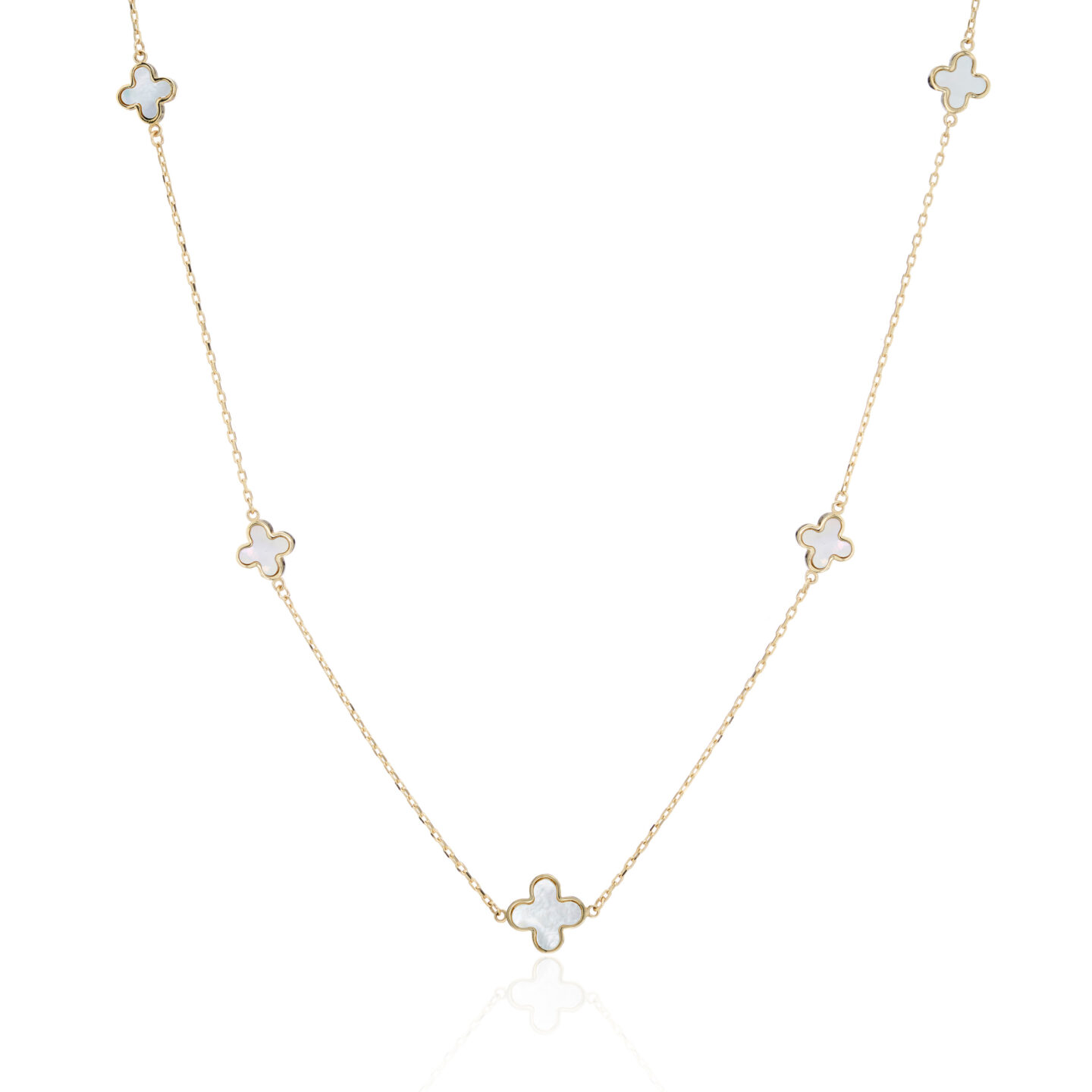 This pretty necklace features five clover motifs, each set with white mother-of-pearl to both sides, spaced along a 9ct yellow gold trace link chain. The necklace has the added benefit of being adjustable between 16″ and 18″ in length for added versatility for the wearer. Ideal for layering alongside other pendants and necklaces, equally striking when enjoyed alone.