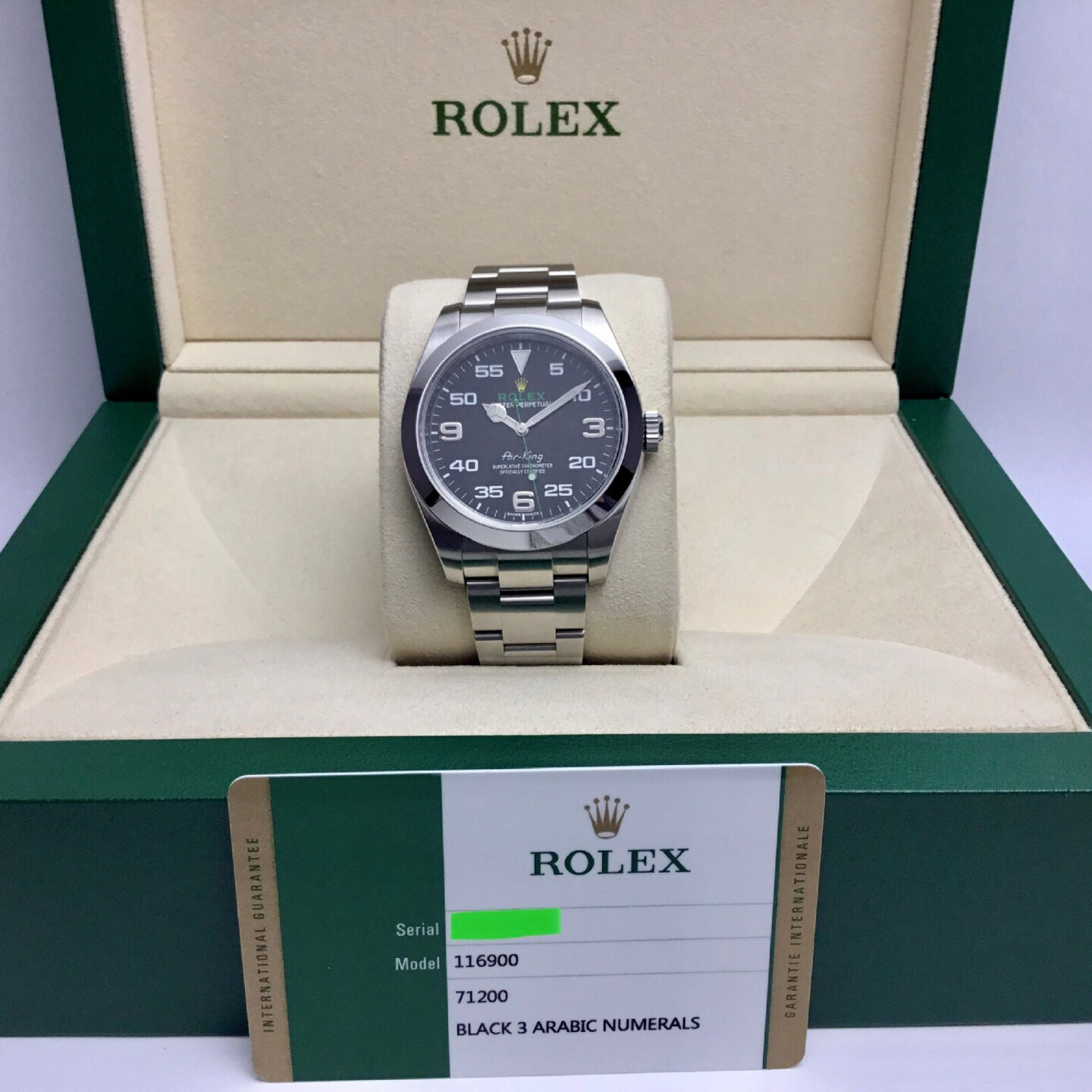 Pre-owned Rolex Oyster Perpetual Air-King watch in Oystersteel. Featuring a chronometer movement, black dial and Oystersteel Oyster bracelet, this watch is in excellent condition. With a 40mm diameter case, sapphire crystal and waterproof to 100m. This watch is complete with original box, papers and all bracelet links.