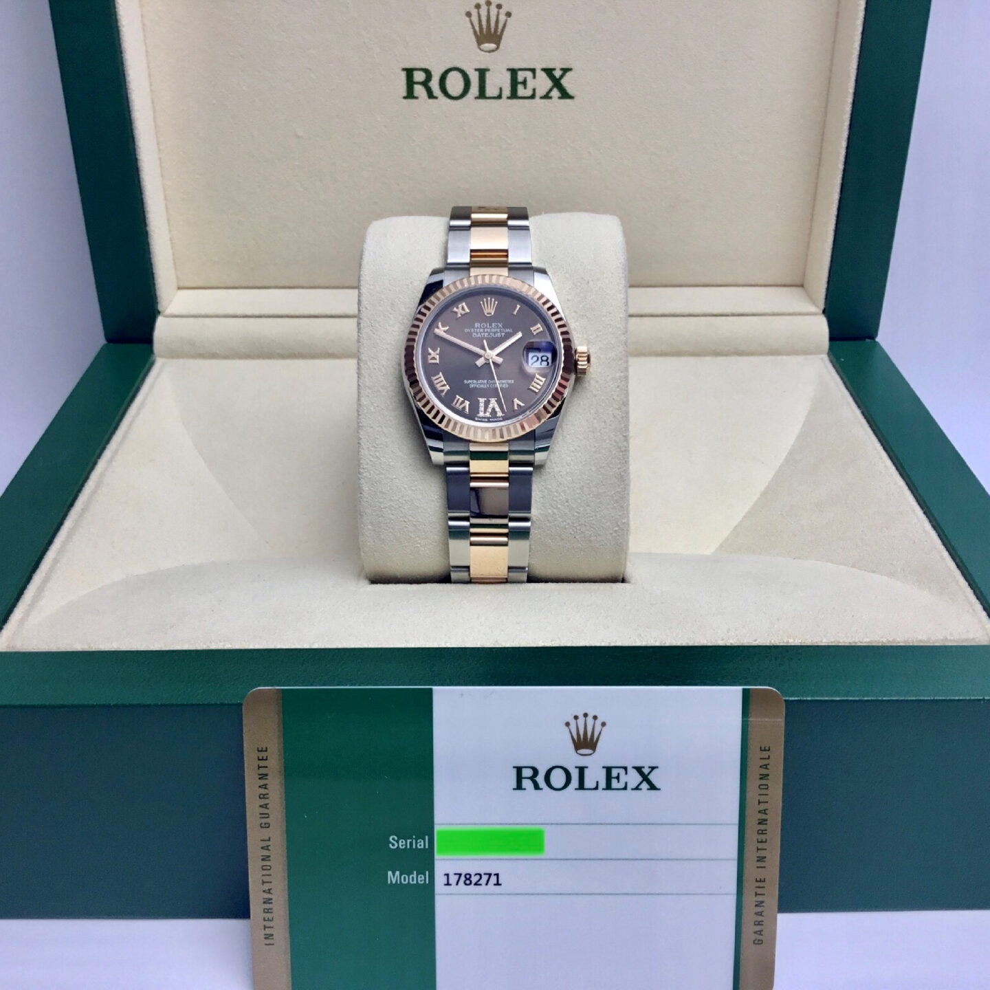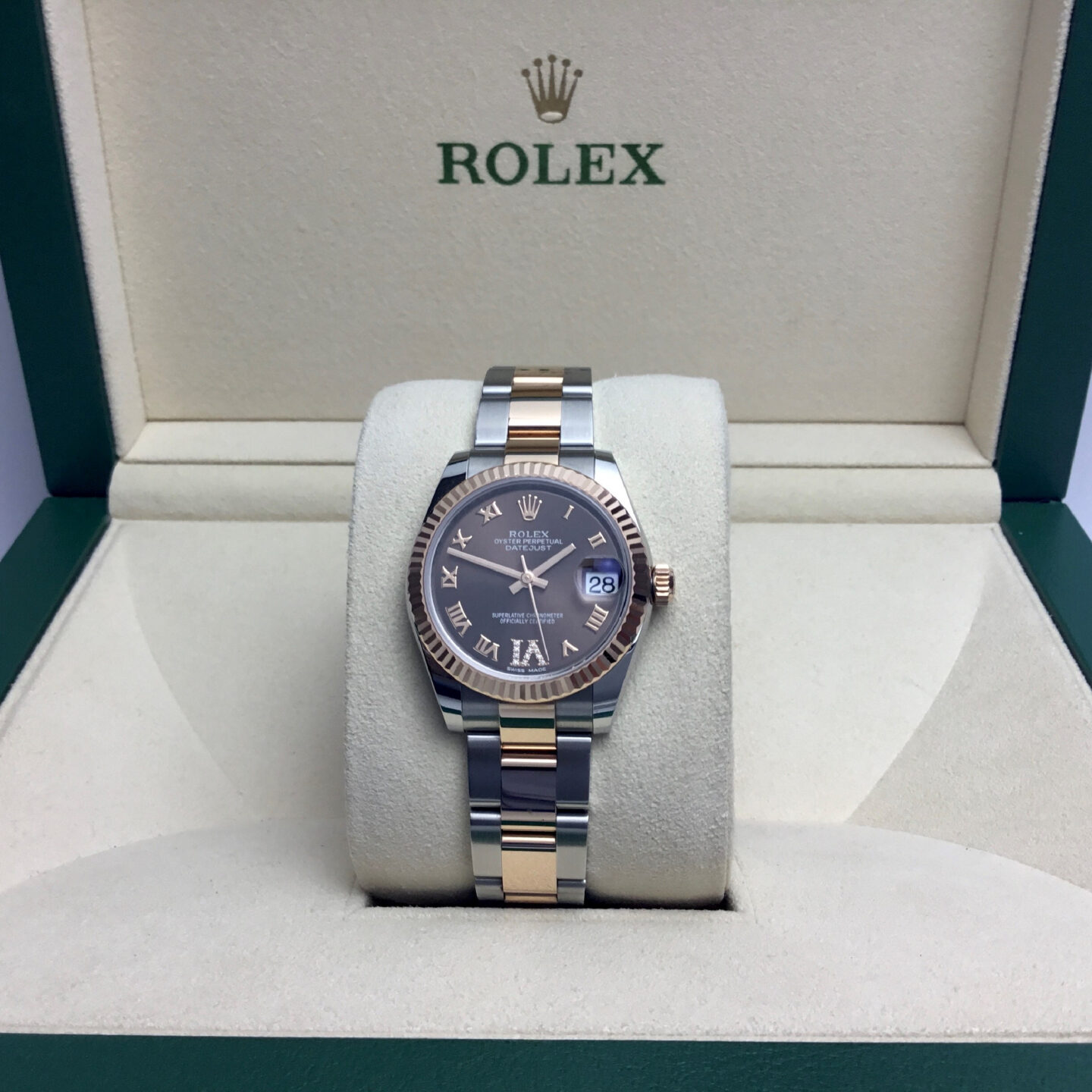 Pre-owned Rolex Oyster Perpetual Datejust 31 watch in 18ct Everose gold and Oystersteel with 18ct Everose gold fluted bezel. Featuring a chronometer movement, chocolate coloured Roman numeral dial with diamond-set VI, 18ct Everose gold and Oystersteel Oyster bracelet. With a 31mm diameter case, sapphire crystal and waterproof to 100m. This watch is in excellent condition, complete with original box, papers and all bracelet links.