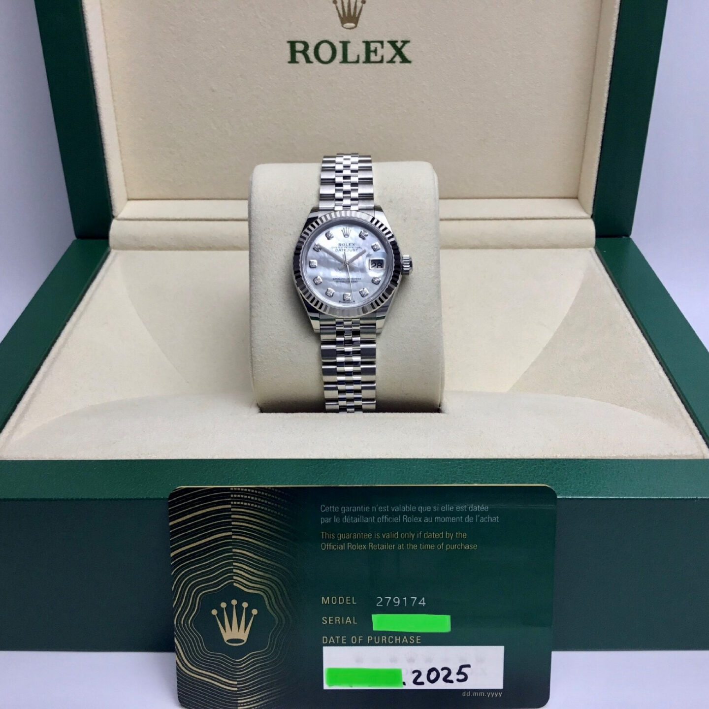 Pre-owned Rolex Oyster Perpetual Lady-Datejust 28 watch in Oystersteel with 18ct white gold fluted bezel. Featuring a chronometer movement, mother-of-pearl diamond-dot dial and Oystersteel Jubilee bracelet. This watch is in excellent condition. Waterproof to 100m.