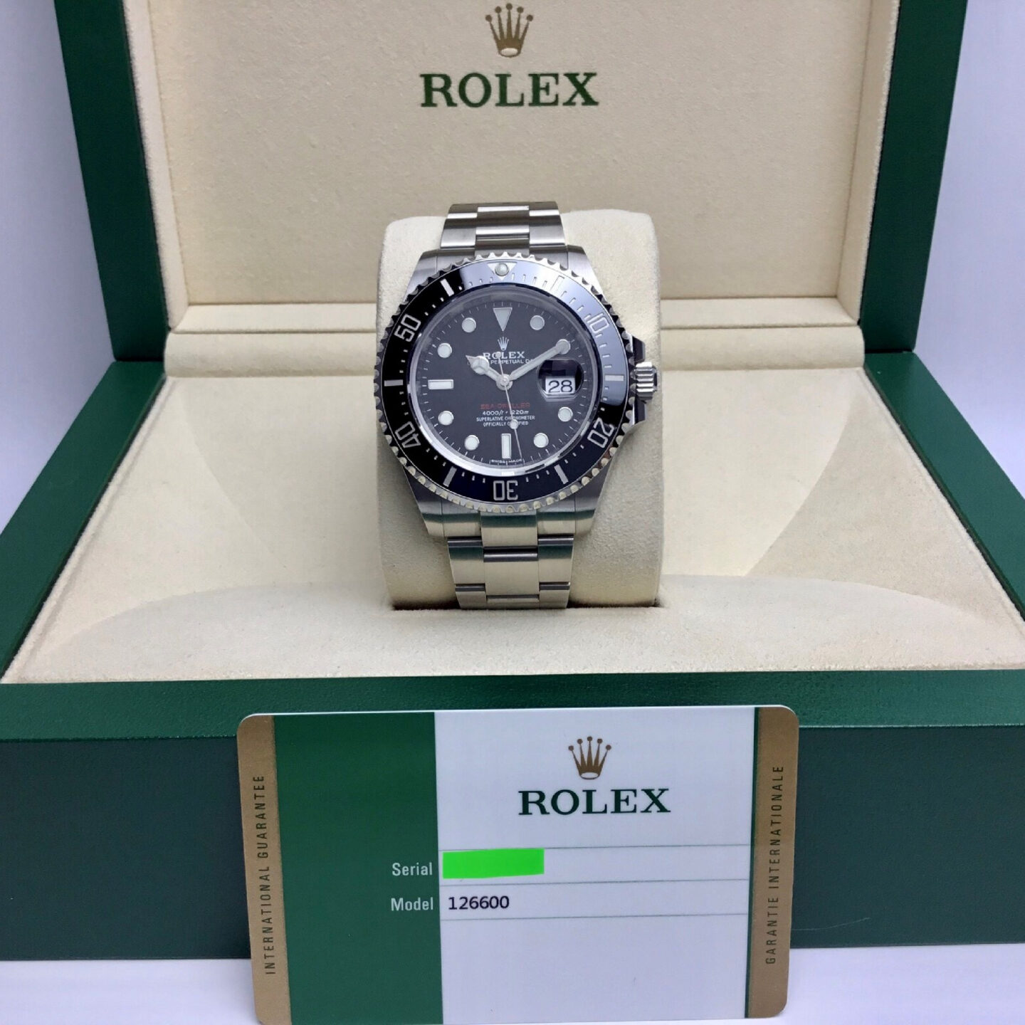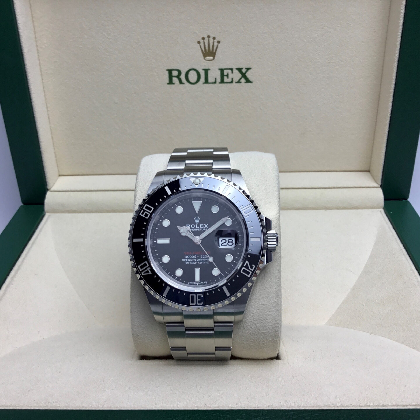Pre-owned Rolex Oyster Perpetual Sea-Dweller watch in Oystersteel. Featuring a chronometer movement, black dial, black Cerachrom rotatable bezel and Oystersteel Oyster bracelet, this watch is in excellent condition. With a 43mm diameter case, sapphire crystal and waterproof to 1220m. This watch is complete with original box, papers and all bracelet links.