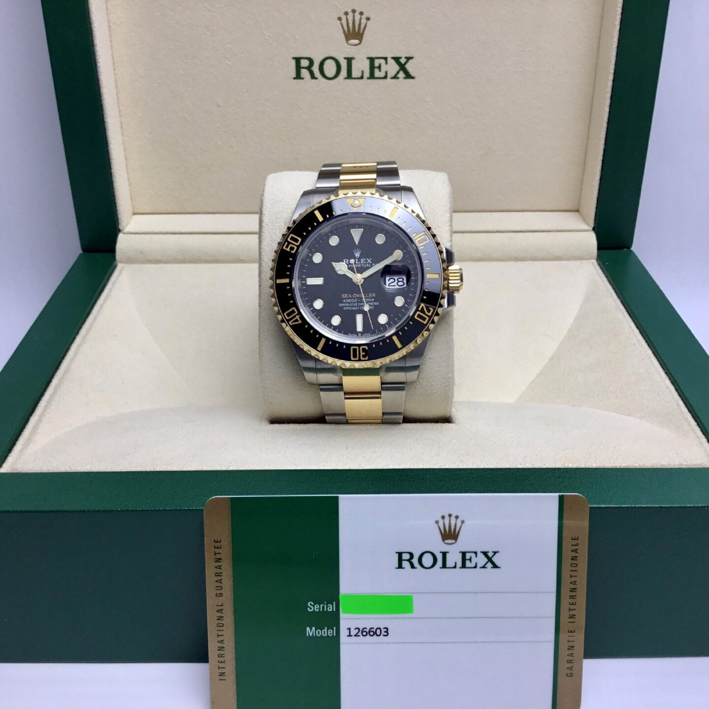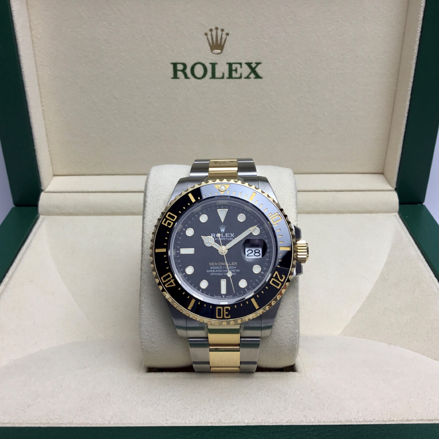 Pre-owned Rolex Oyster Perpetual Sea-Dweller watch in 18ct yellow gold and Oystersteel. Featuring a chronometer movement, black dial, black Cerachrom rotatable bezel and 18ct yellow gold and Oystersteel Oyster bracelet, this watch is in excellent condition. With a 43mm diameter case, sapphire crystal and waterproof to 1220m. This watch is complete with original box, papers and all bracelet links.