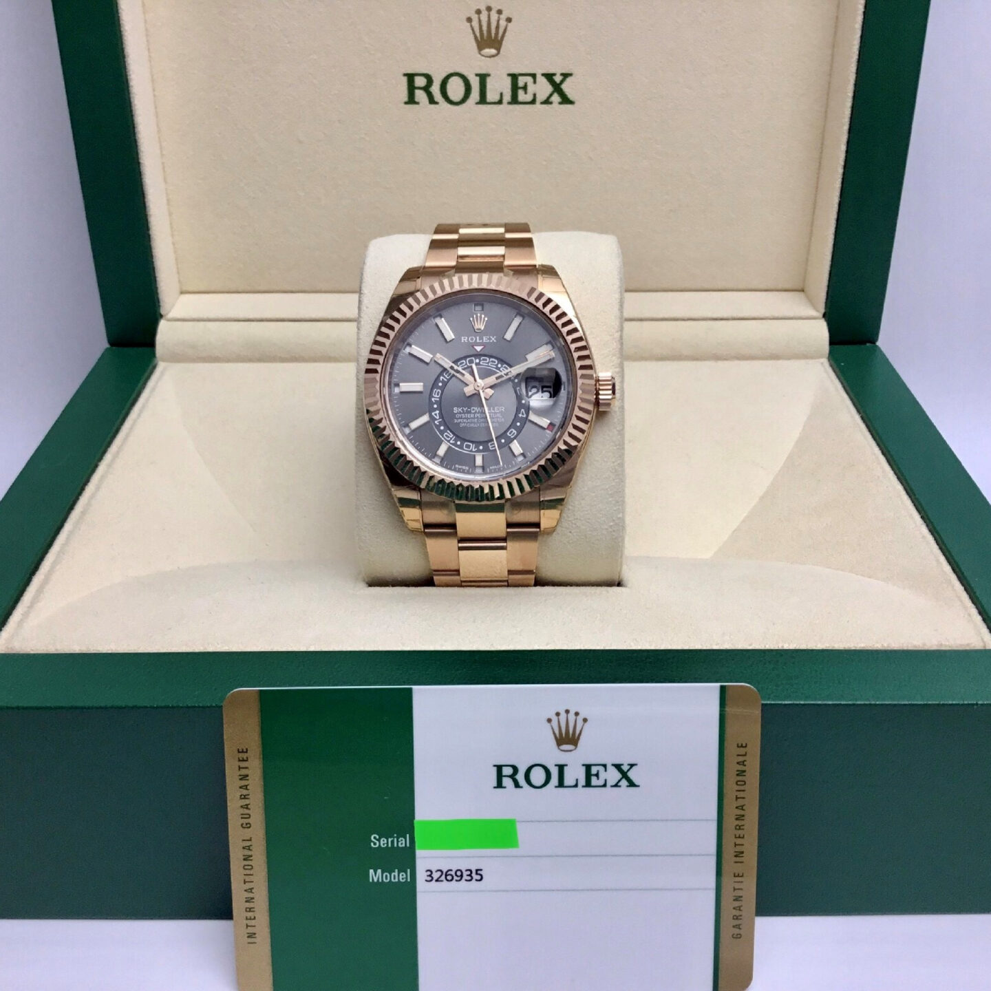 Pre-owned Rolex Oyster Perpetual Sky-Dweller watch in 18ct Everose gold with fluted bezel with Ring Command system. Featuring a chronometer movement, 42mm case, sapphire crystal and waterproof to 100m. This stunning watch features a grey dial with luminous indices and Oystersteel Oyster bracelet.