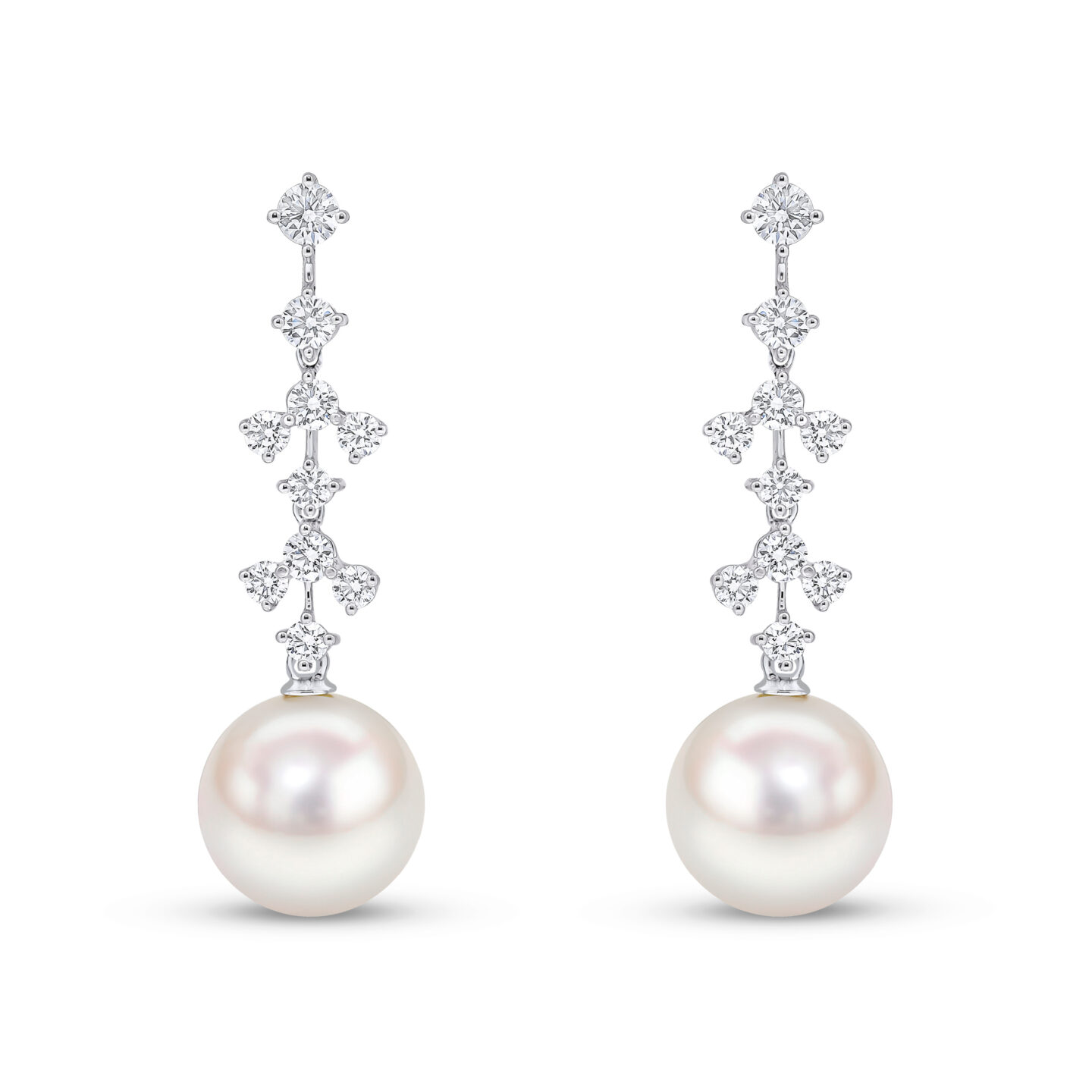 These stunning earrings each feature a single South-Sea cultured pearl fixed to the bottom of a dazzling diamond drop. Crafted from 18ct white gold, these striking earrings move beautifully in the ear, showcasing the multiple diamonds and luxurious South-Sea cultured pearls. The earrings are secured with 18ct white gold post and scroll fittings.