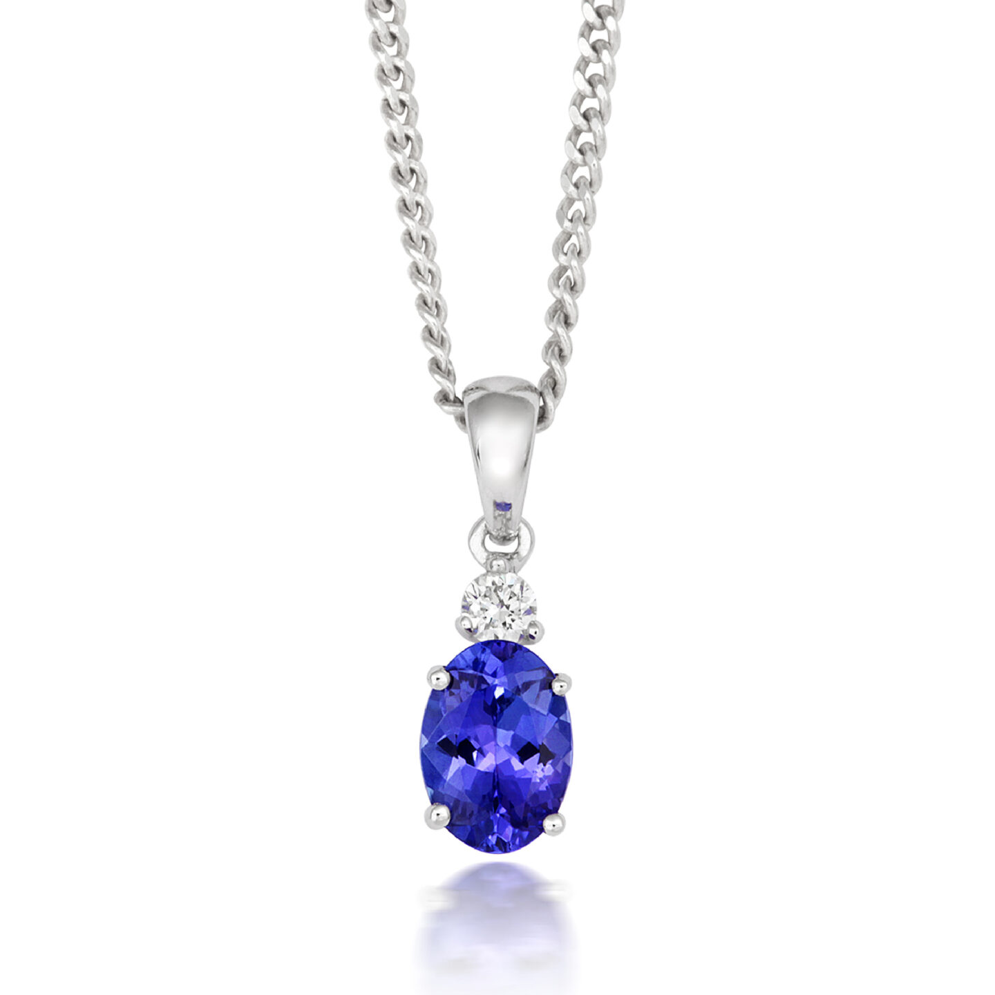 This beautiful pendant features an oval cut tanzanite with a single round brilliant cut diamond set above for a classic, timeless look. Complete with an 18ct white gold trace chain.